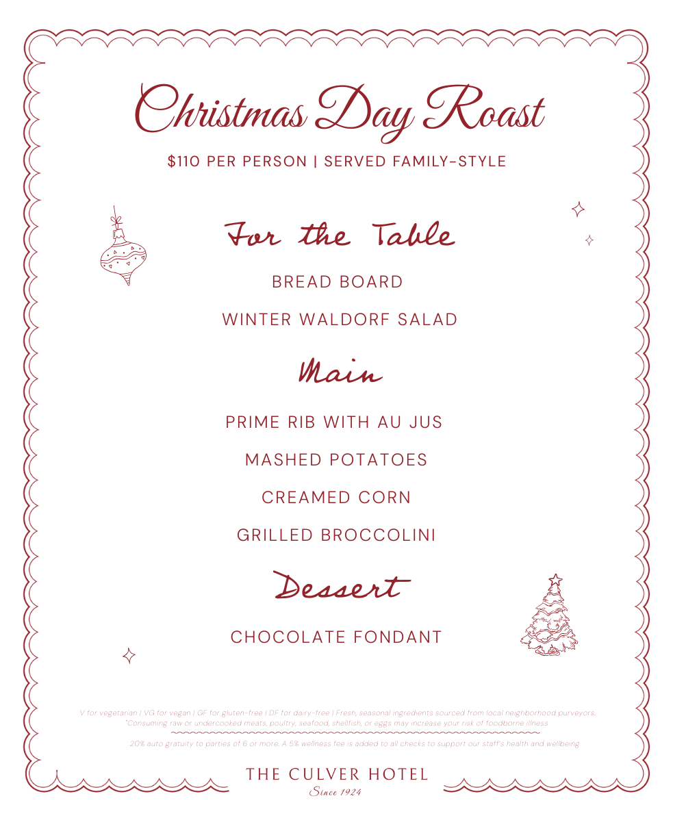 Christmas Eve at The Culver features à la carte holiday specials, served in a setting where vintage charm meets seasonal warmth.